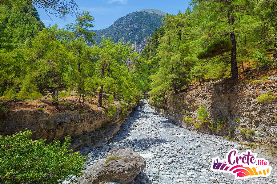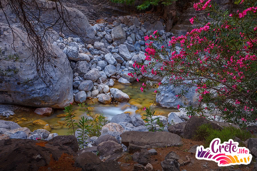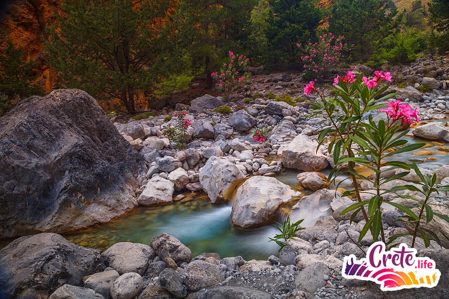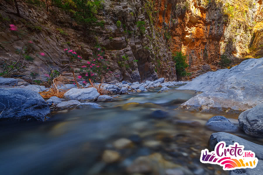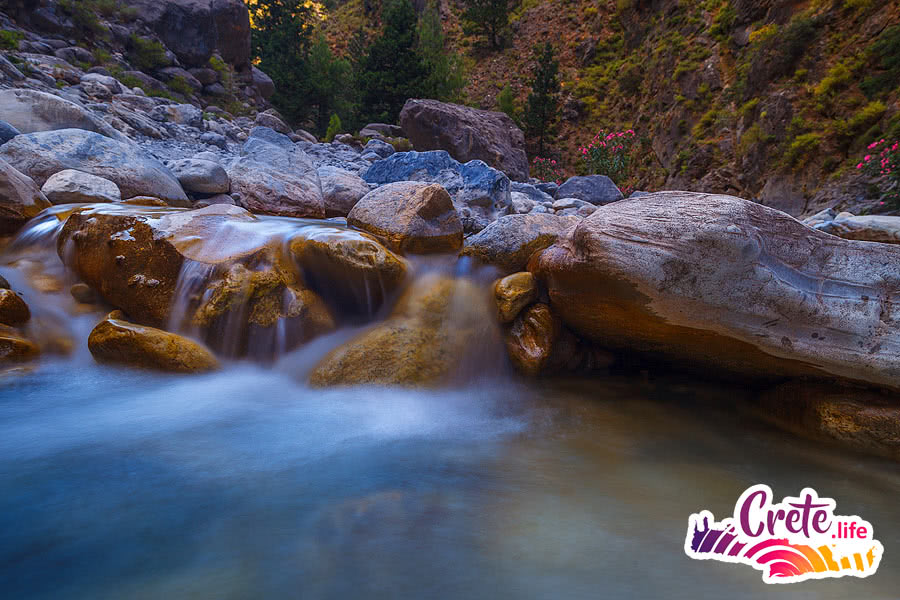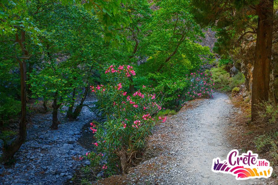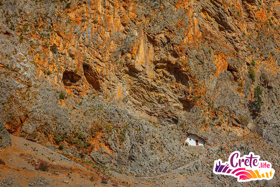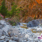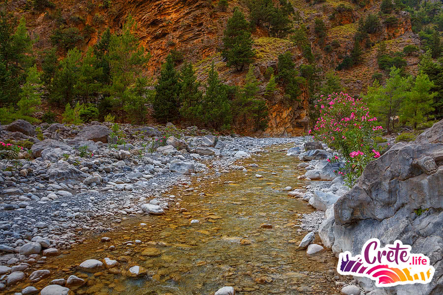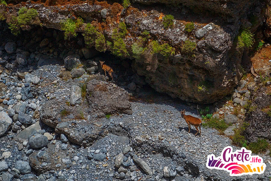 Along the way, you’ll find several rest stops with refreshing spring water and shades. Note the small river (especially in spring) that meanders in and out of sight, adding a touch of serenity to your journey, and when you reach the sighn with a 4-kilometer mark, don’t miss the opportunity to visit the charming Agios Nikolaos (Saint Nicholas) ancient chapel dedicated to the saint. And keep your eyes on the rock walls! You may be lucky enough to see the famous Cretan mountain goats Kri-Kri!