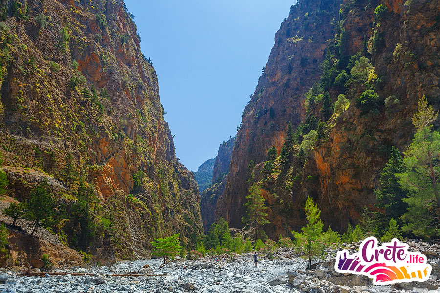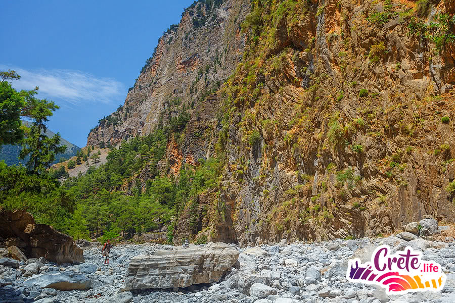 It is important to note two things: firstly, you will be descending all the way, because the path through the Samaria Gorge goes from the top down to the sea and the village of Agia Roumeli. Secondly, only the initial 4 kilometers of this trail are the most challenging due to the steep descent. But do not be afraid, as the trail gradually levels out, although it is still quite long.